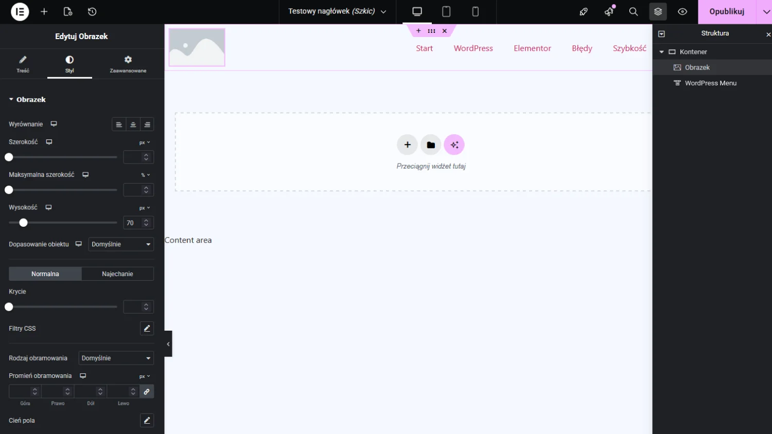 Najpierw dodaj logo: możesz użyć widżetu typu „Logo strony” albo zwykłego obrazka. W zakładce „Styl” ustaw wysokość obrazka na 70px – to wystarczająca wartość, żeby zachować czytelność, ale też nie za duża, aby logo nie dominowało w nagłówku. Jeśli Twoje logo ma nietypowe wymiary lub jest bardzo wysokie, może być konieczne dopasowanie tej wartości. Pamiętaj, że nagłówek nie powinien być zbyt wysoki. W innym wypadku będzie zajmował za dużo miejsca, szczególnie na widoku mobilnym. Staraj się zachować wysokość nagłówka poniżej 90px.