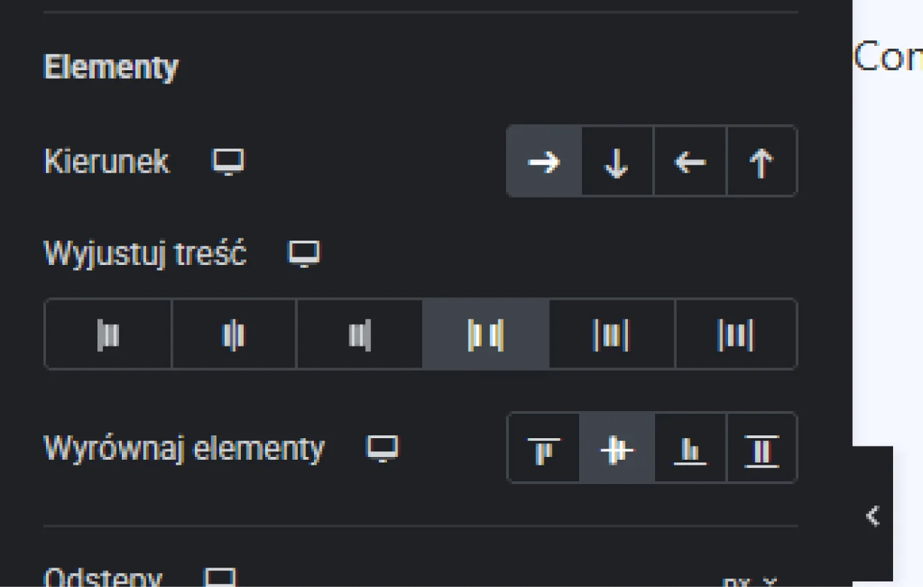 Zacznijmy od początku: za pomocą Elementora dodaj pierwszy kontener, w którym umieścisz pozostałe elementy. Jeśli Elementor zapyta Cię o rodzaj układu, wybierz „Elastyczne pole”, a w przypadku struktury „Kierunek wiersza” (obrazek ze strzałką w prawą stronę). W tej samej zakładce, upewnij się, że zaznaczone są opcje „Wyjustuj treść” -> „Odstęp pomiędzy” oraz „Wyrównaj elementy” -> „Wyśrodkowanie”. Zapewni to poprawne wyrównanie elementów w pionie i w poziomie wewnątrz nagłówka.