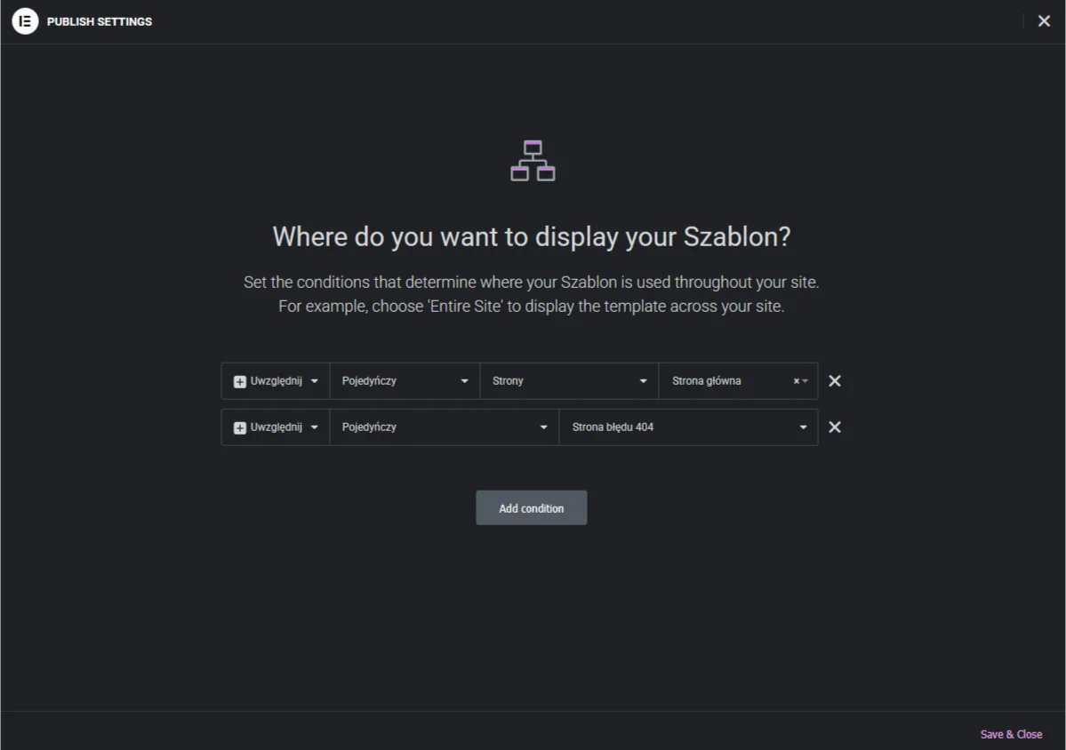 Na tym etapie możesz opublikować szablon nagłówka. Po publikacji Elementor poprosi o warunki wyświetlania. Jeśli to Twój pierwszy header na stronie, najbezpieczniej ustaw „Add condition” -> „Uwzględnij” -> „Entire site”. Dzięki temu od razu widzisz efekt na różnych podstronach i masz pewność, że to „główny” nagłówek serwisu widoczny na każdej z nich.